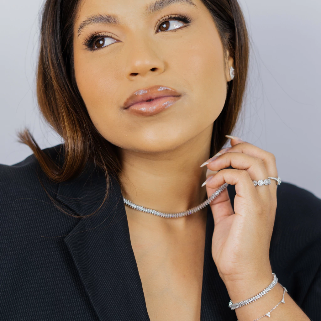 Diferencial exclusivo Hizzi Pratas: assim como nossa Riviera tradicional, este modelo foi milimetricamente desenvolvido para que os brilhos permaneçam sempre expostos. O acabamento inteligente em prata garante que o colar não vire, proporcionando caimento impecável, conforto e luminosidade constante.